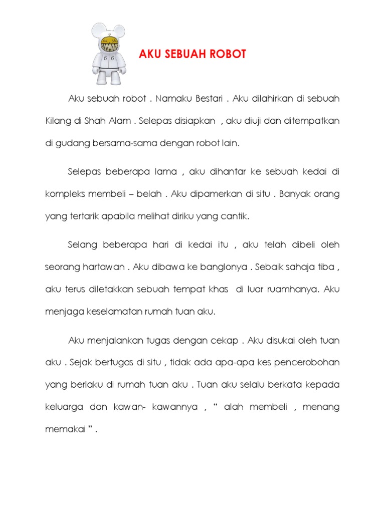 Robot Bergerak Mobile Ciri khasnya adalah mempunyai aktuator berupa roda untuk menggerakan keseluruhan badan robot tersebut sehingga robot dalam melakukan perpindahan posisi dari satu titik ke titik yang lain. May 03 2018 ini adalah contoh karangan jenis cerita tahun 3. Karangan stpm menyediakan beberapa contoh karangan untuk dijadikan bahan rujukan kepada pelajar.